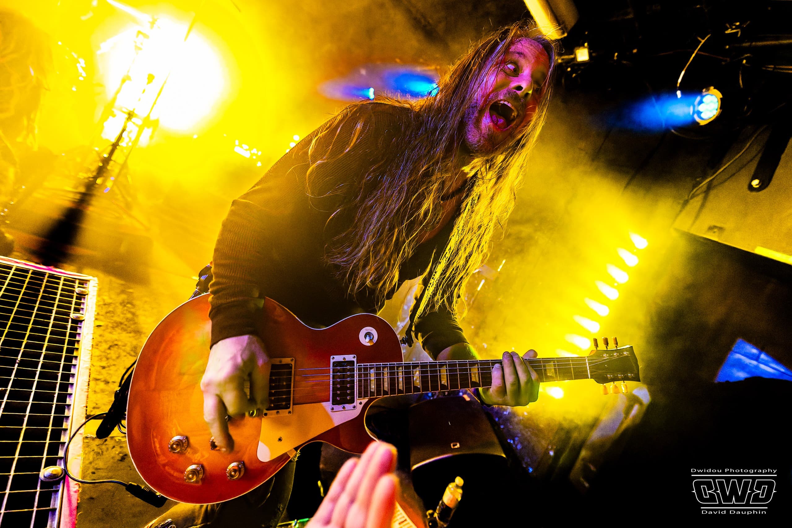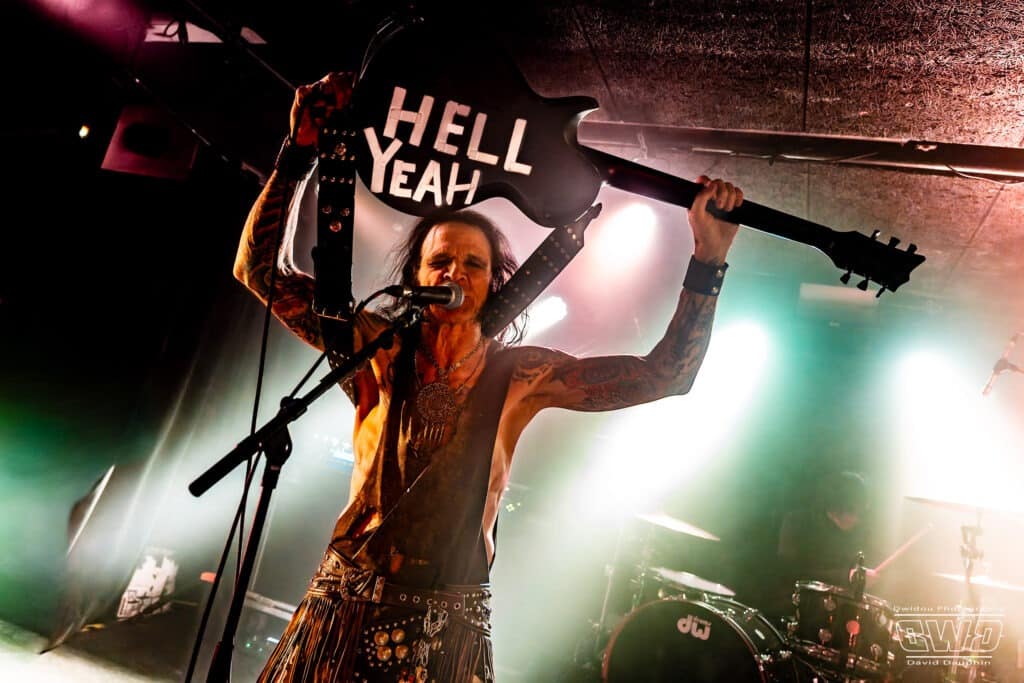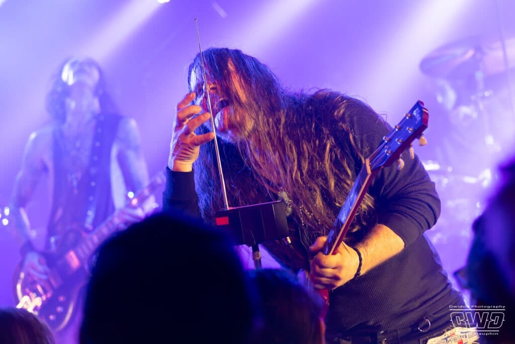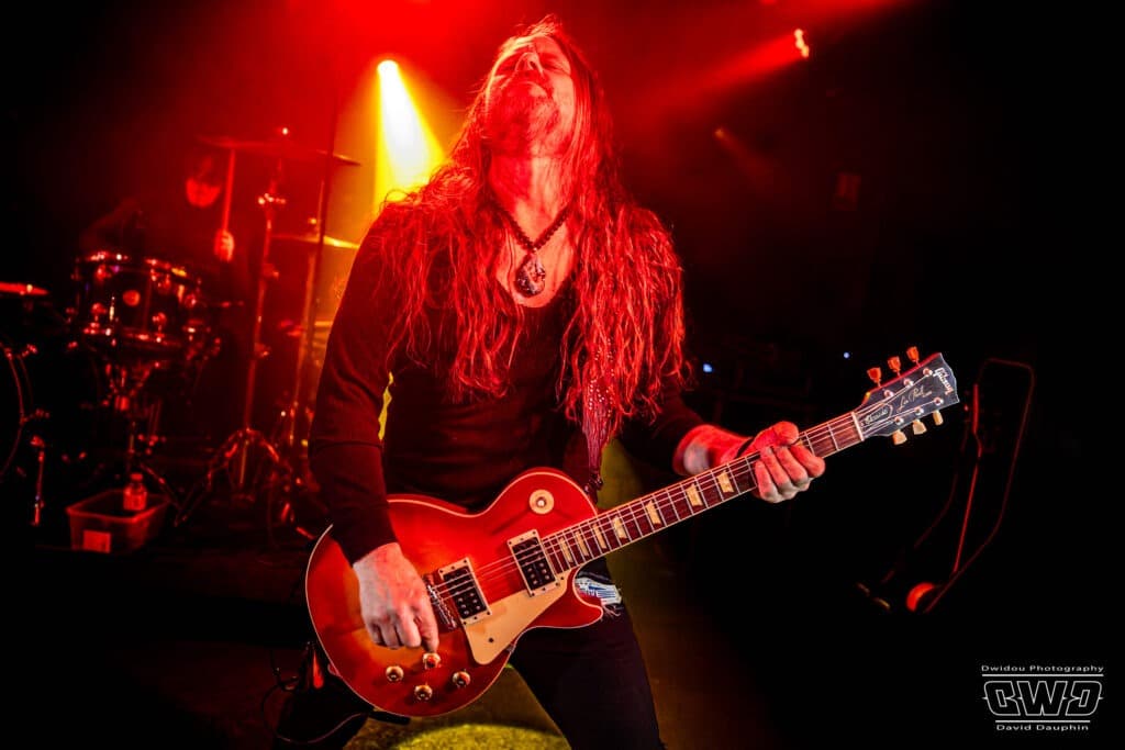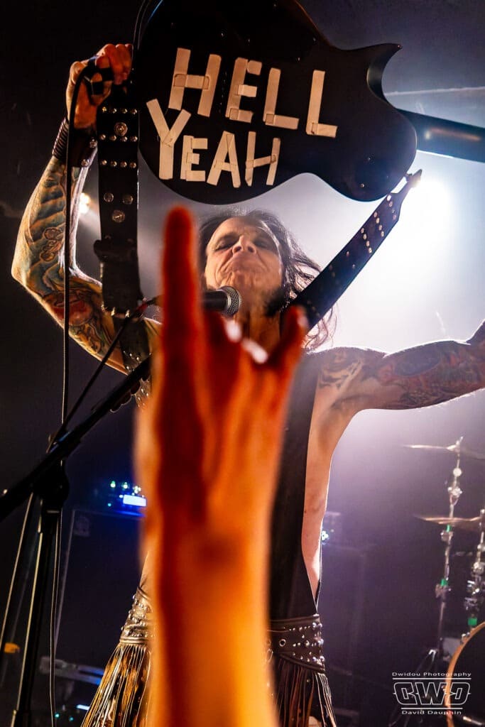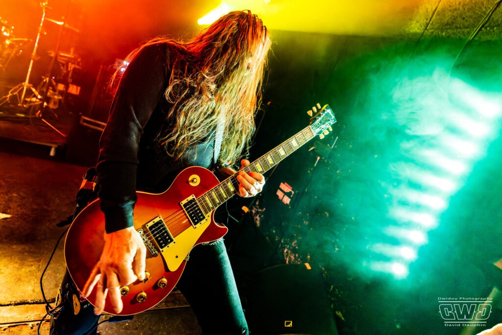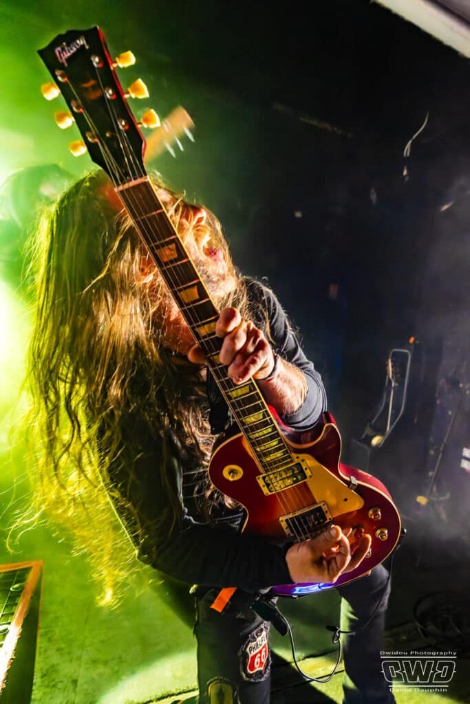 Chuck s’amuse, et amuse aussi la galerie, en montrant l’envers de ses guitares, l’une avec un marquage « Hell Yeah », une autre avec un « Loud ». Ça bastonne sévère avec des riffs acérés et des rythmiques écrasantes. La batterie se déchaine, mais malheureusement on aperçoit que très peu l’excellent Tim Husung, dans la pénombre et la fumée de fond de scène derrière son kit batterie.
