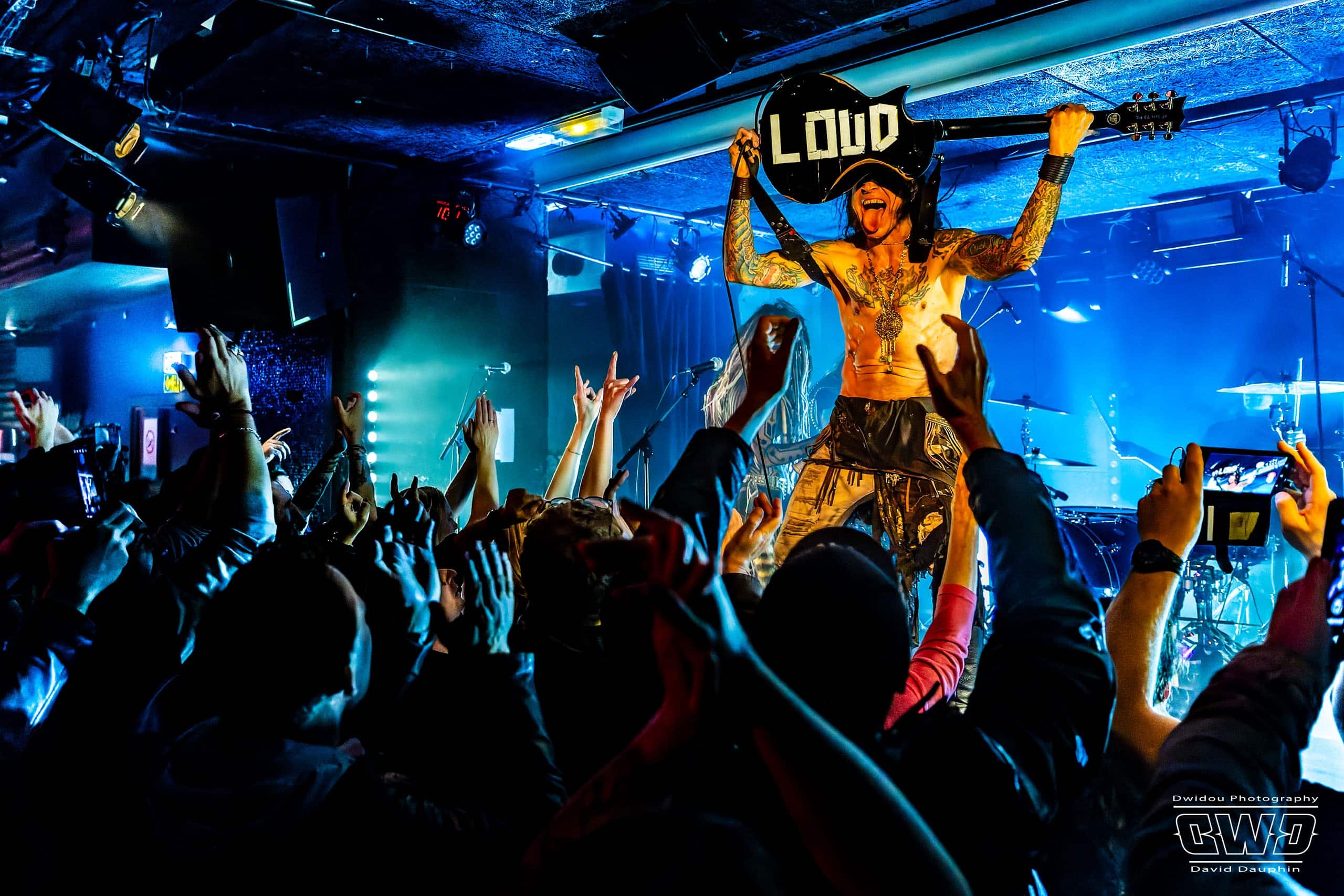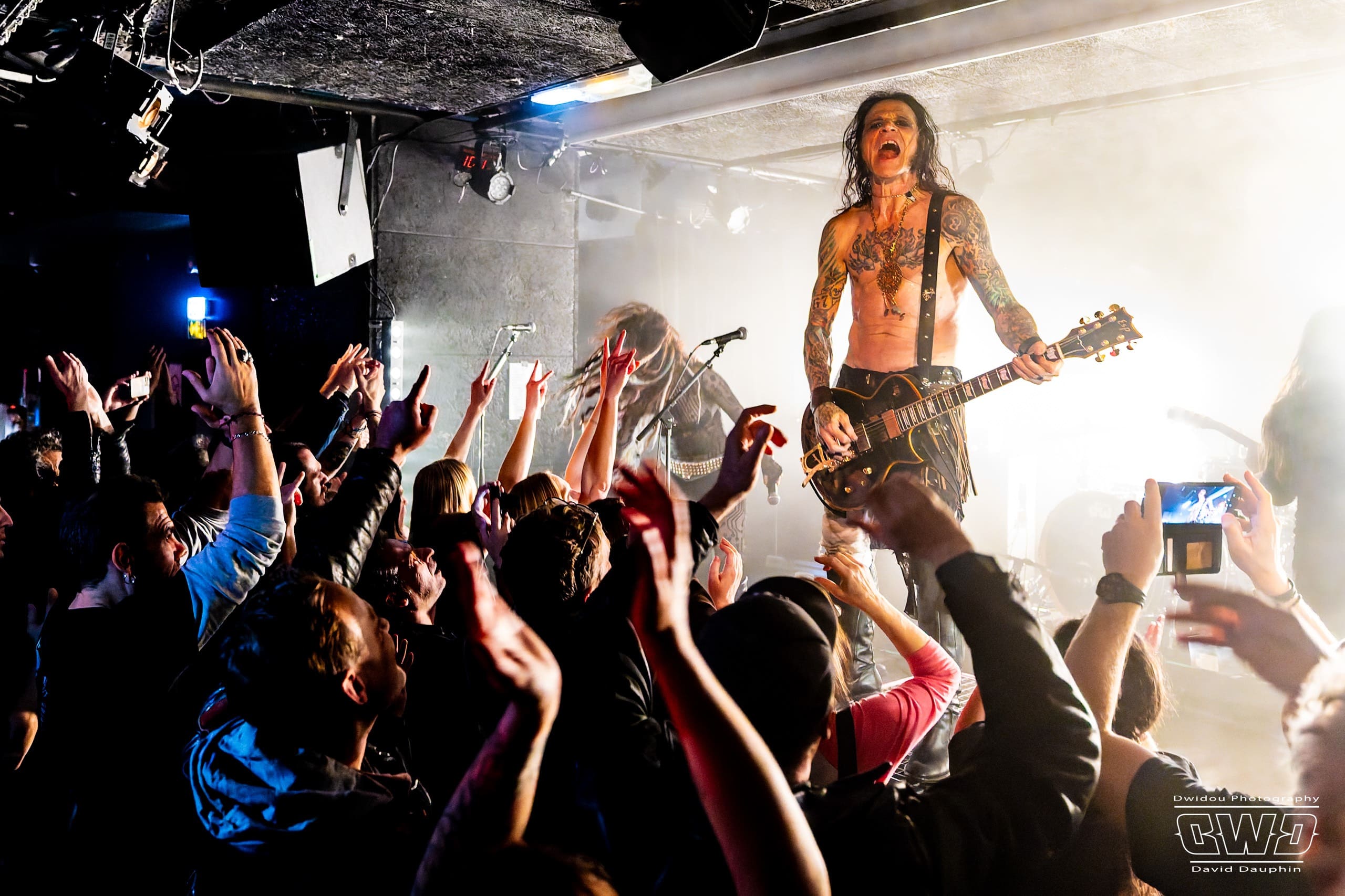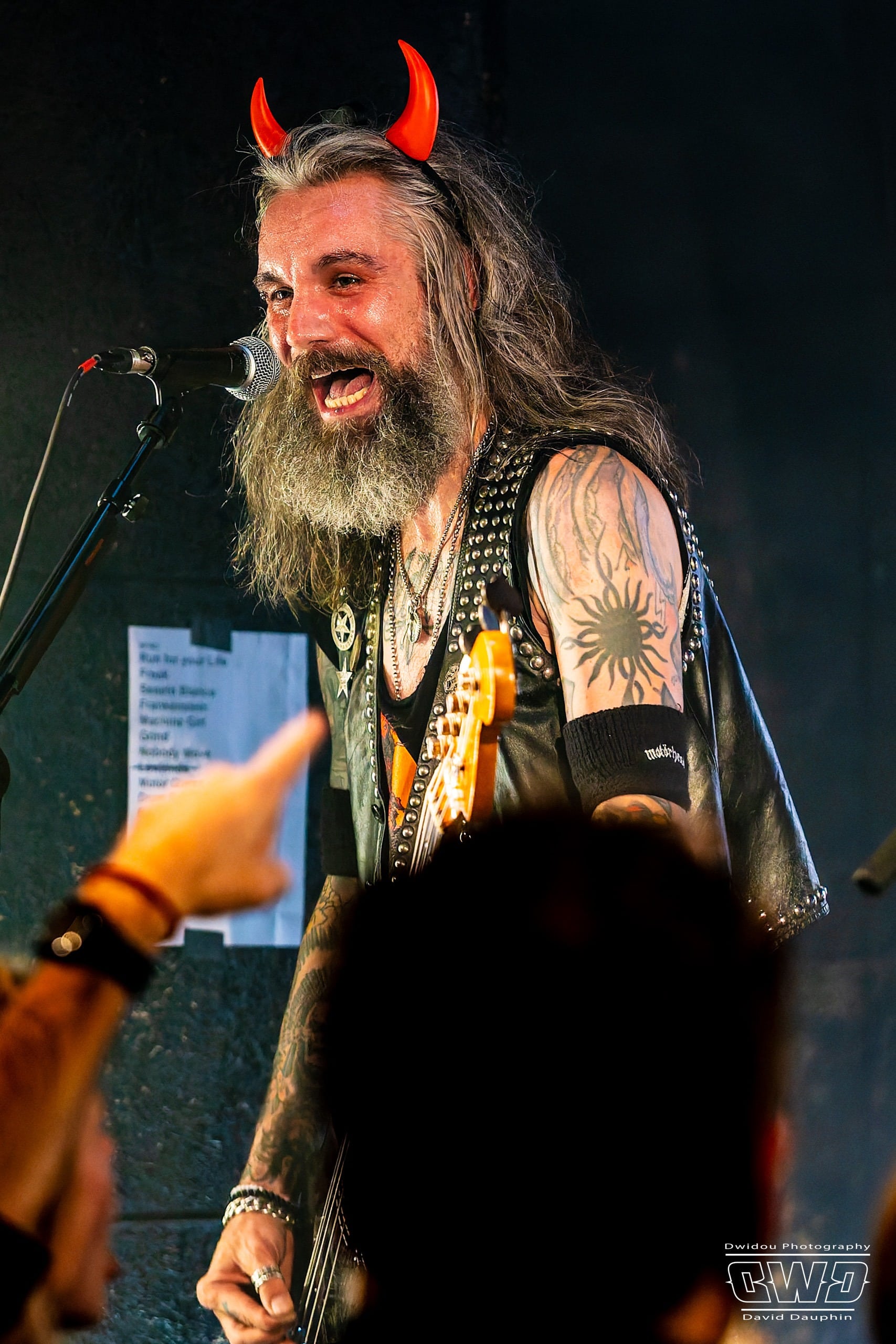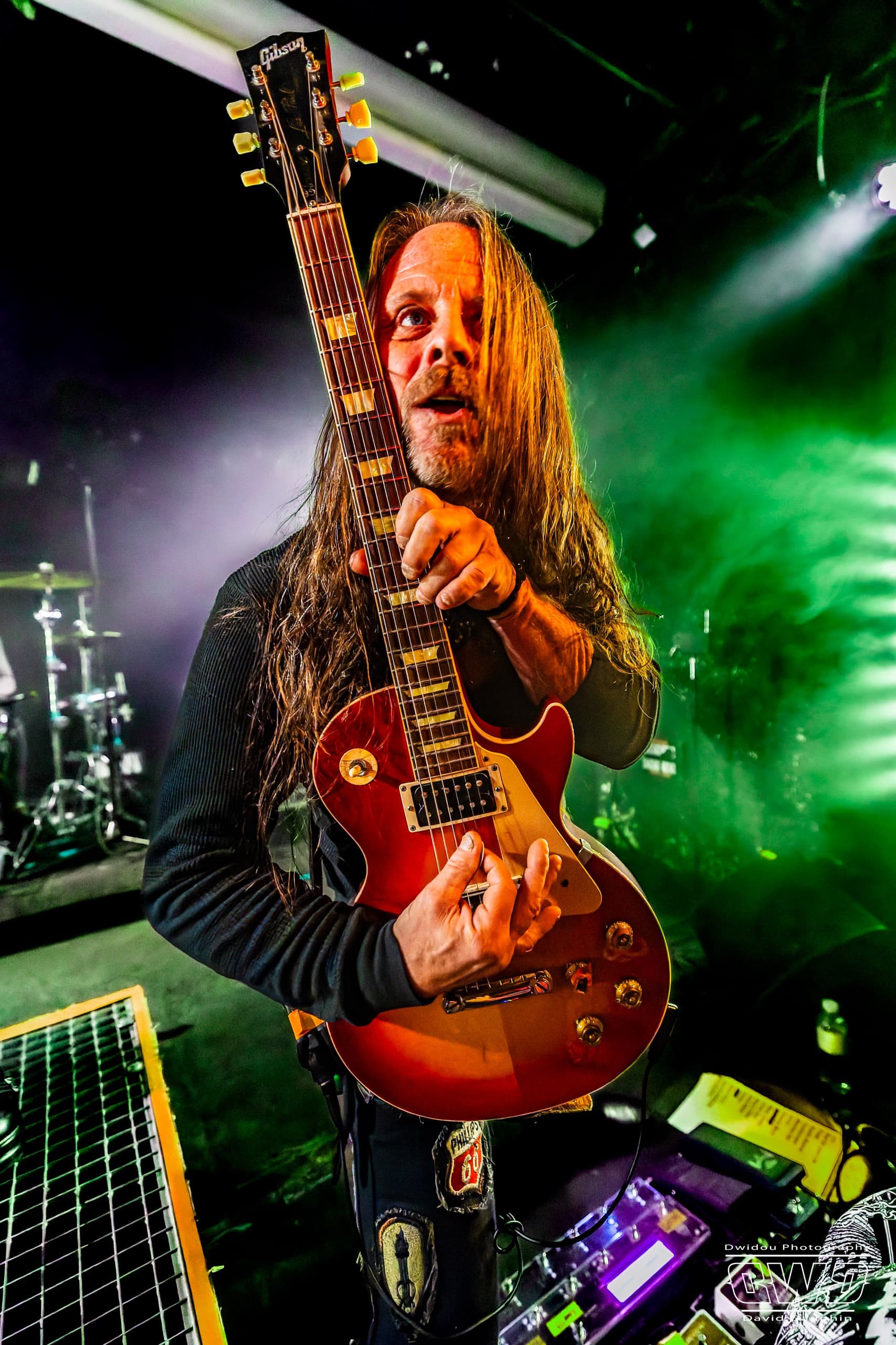 Chuck s’amuse, et amuse aussi la galerie, en montrant l’envers de ses guitares, l’une avec un marquage « Hell Yeah », une autre avec un « Loud ». Ça bastonne sévère avec des riffs acérés et des rythmiques écrasantes. La batterie se déchaine, mais malheureusement on aperçoit que très peu l’excellent Tim Husung, dans la pénombre et la fumée de fond de scène derrière son kit batterie.