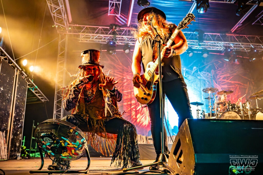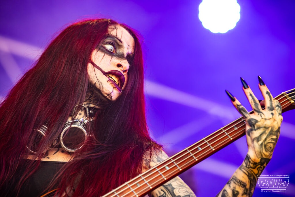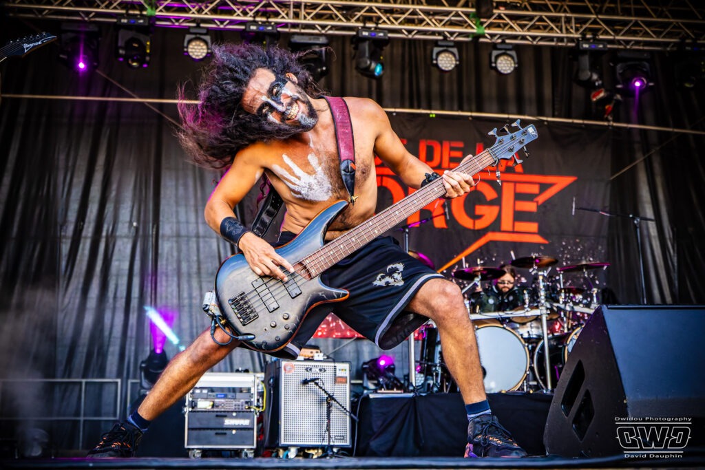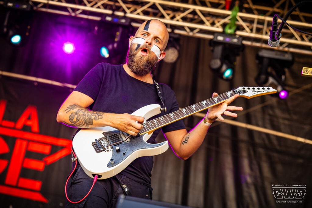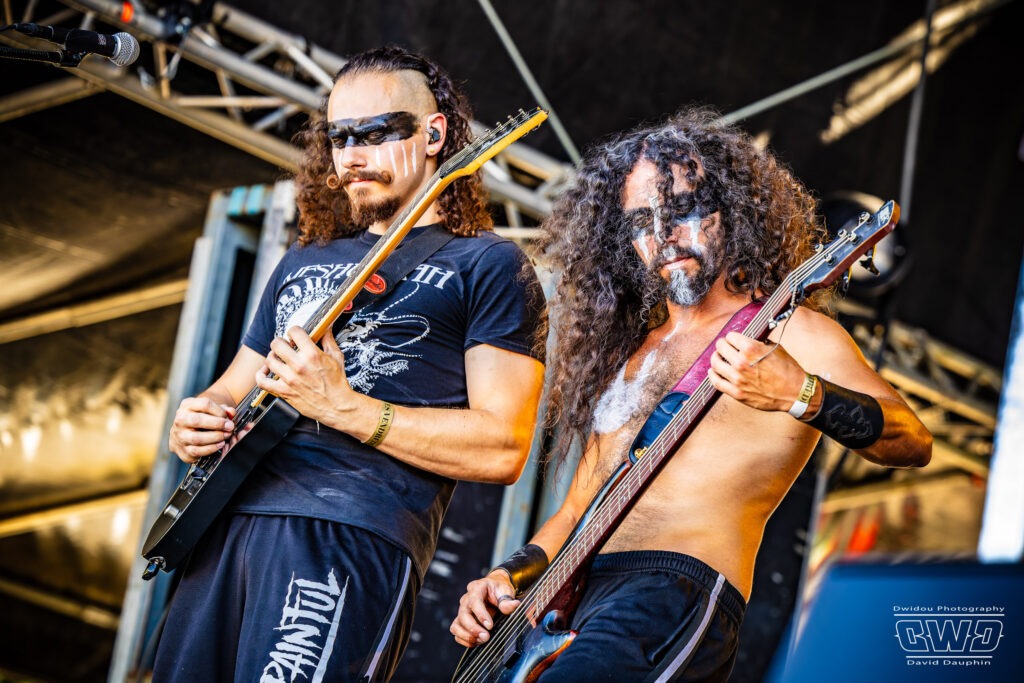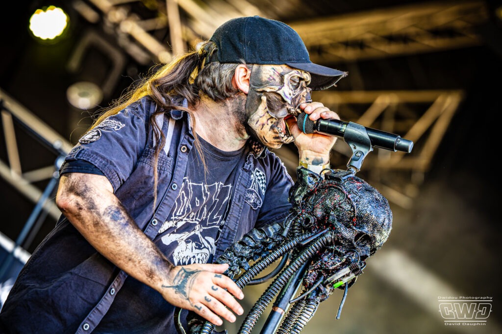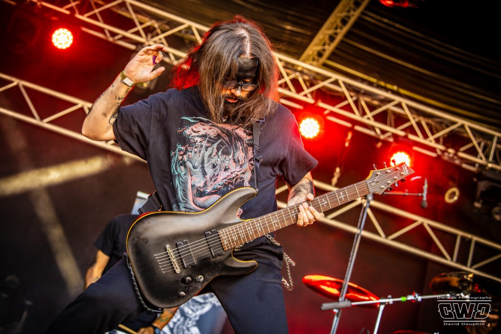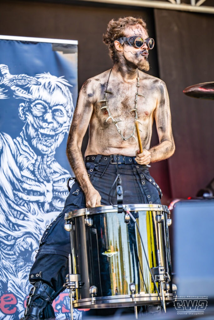 Changement de scène et changement d’ambiance avec les marseillais de Lecks Inc. Le groupe envoie un lourd Metal Indus qu’il a déjà gravé sur 2 albums en 2022 et 2023. Les musiciens entièrement grimés font sensation auprès des festivaliers. 2 percussionnistes complètent une formation traditionnelle (Basse, batterie, 2 guitares et chant) et font le show au milieu de la troupe.