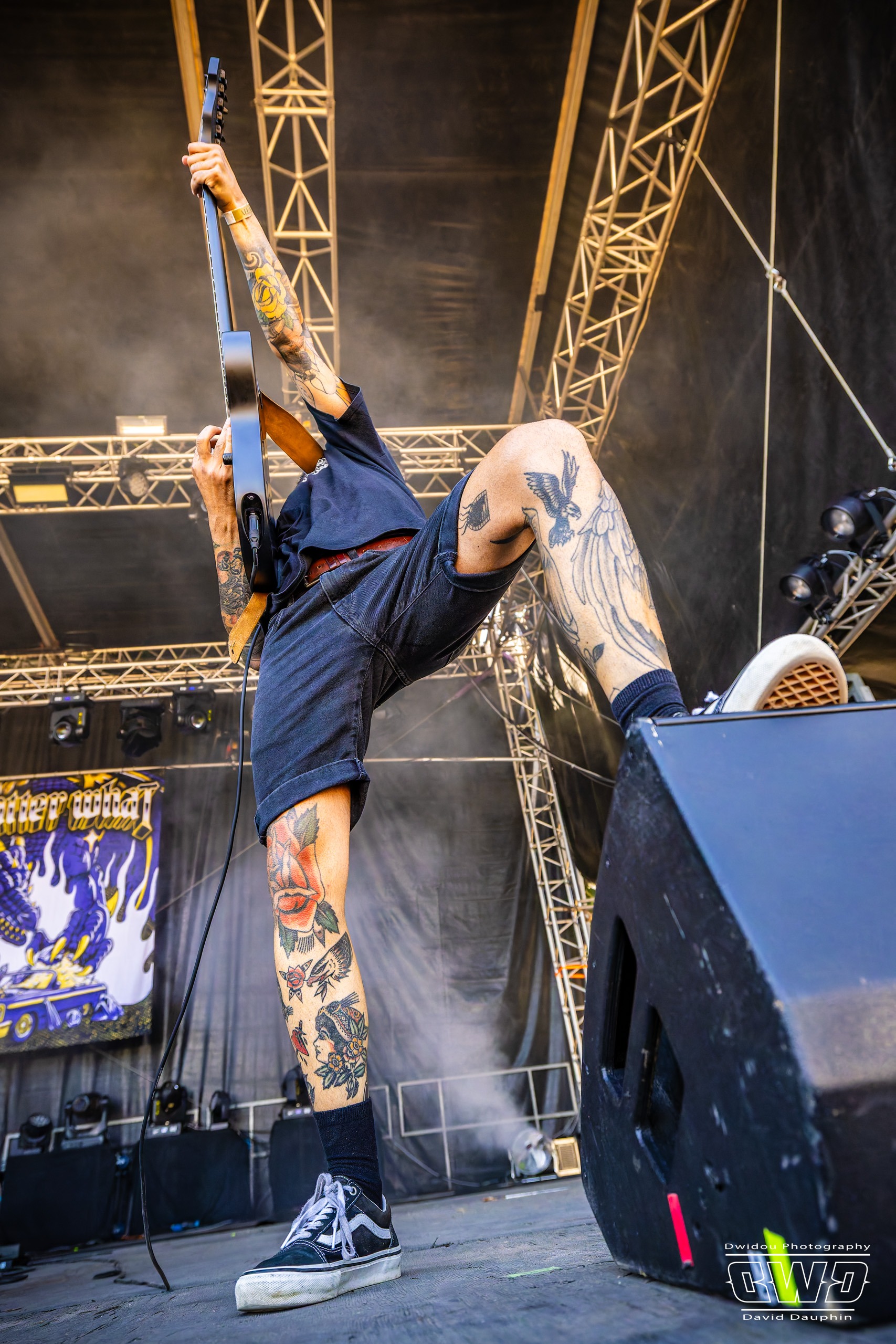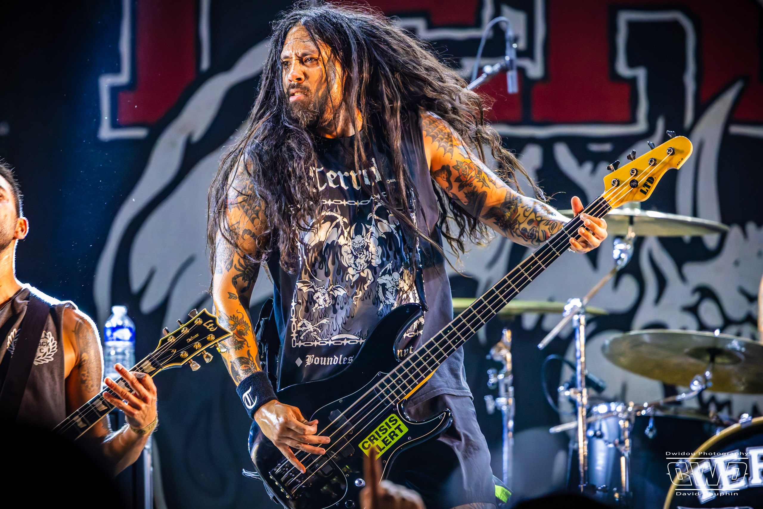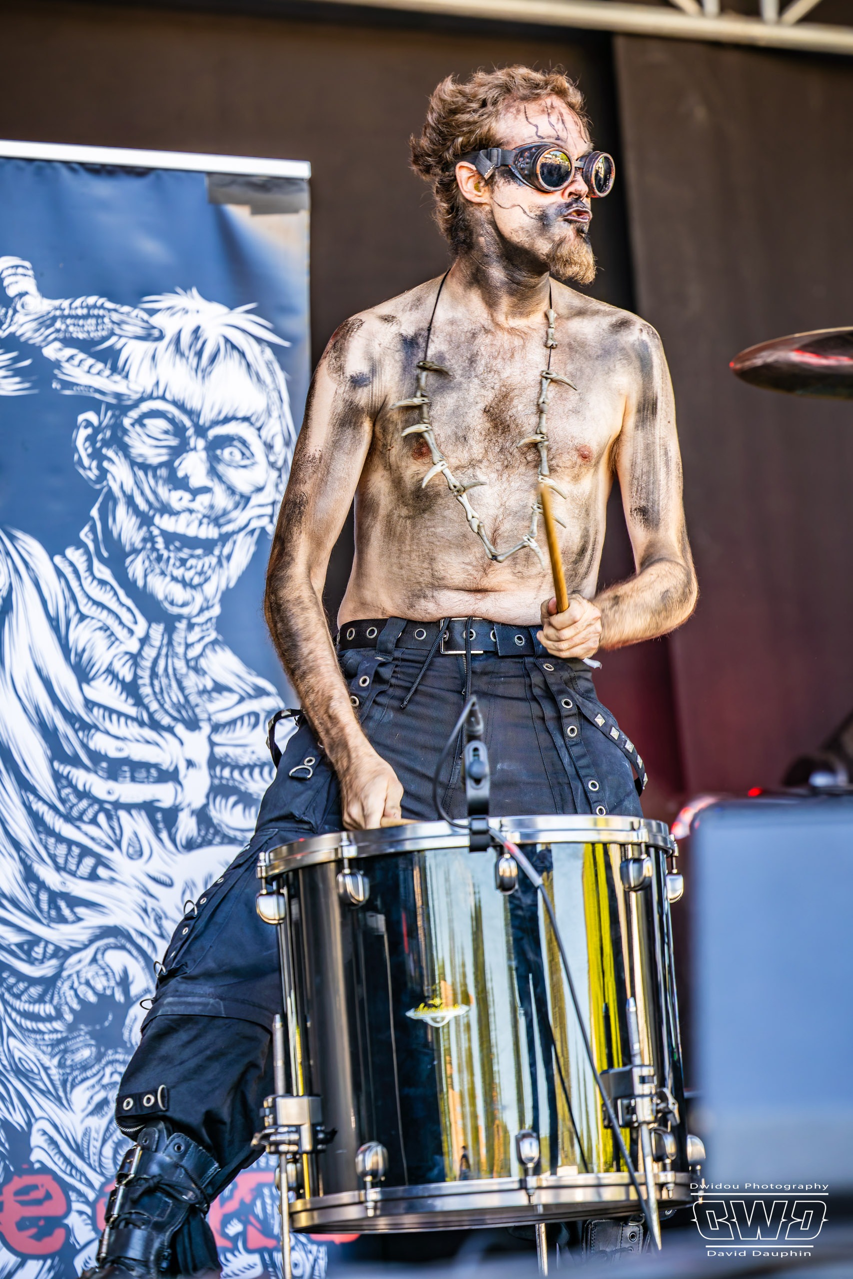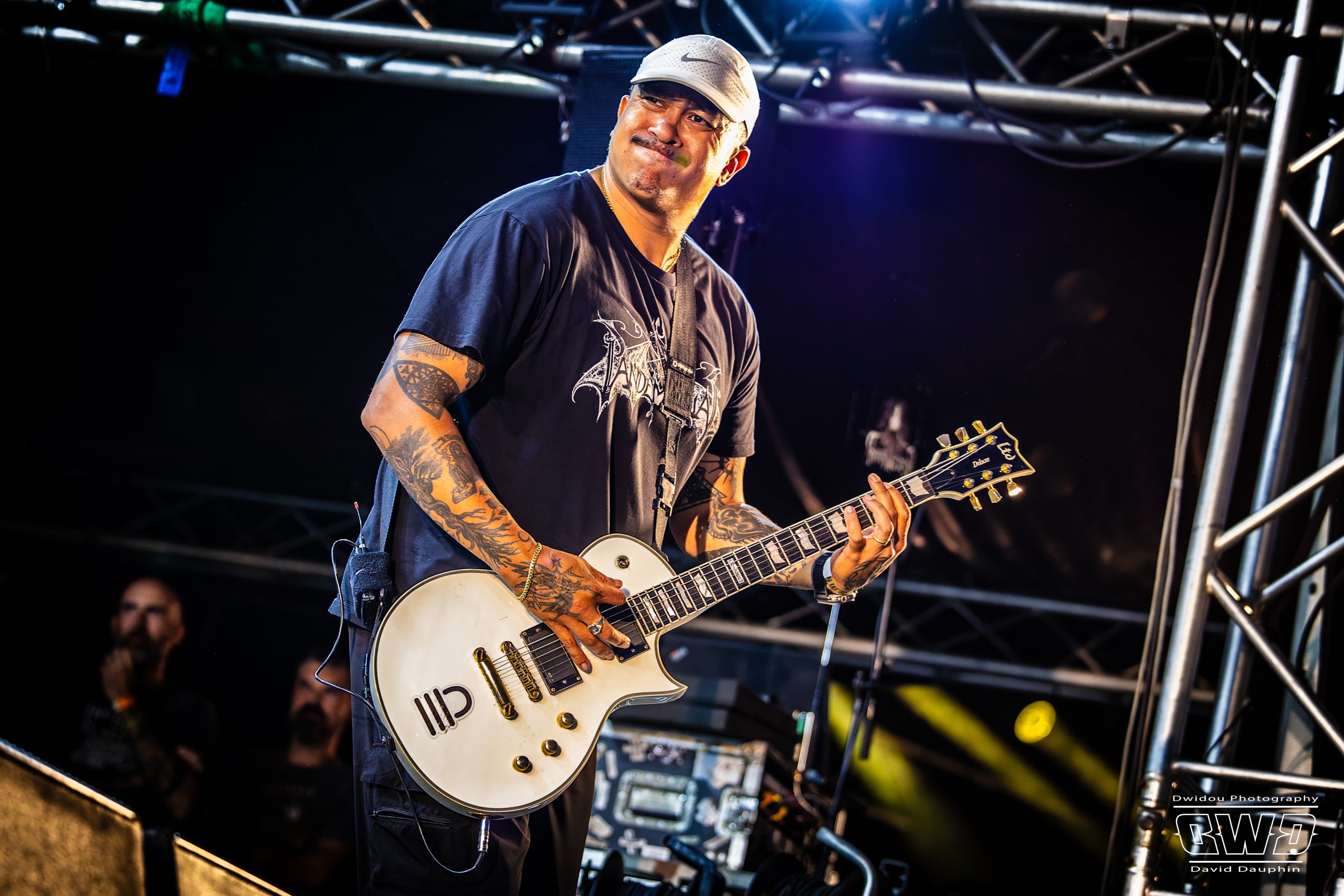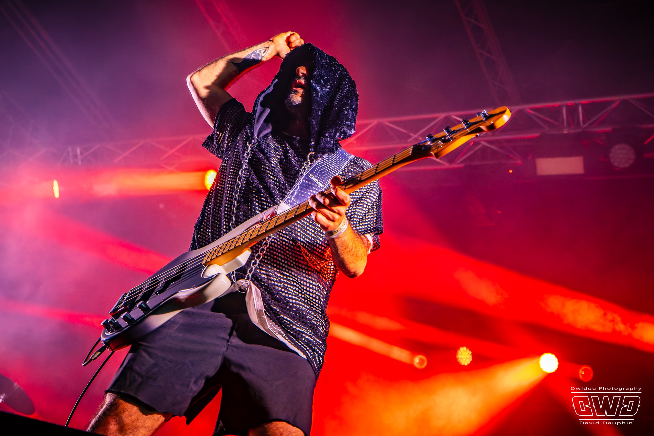 Changement de scène et changement d’ambiance avec les marseillais de Lecks Inc. Le groupe envoie un lourd Metal Indus qu’il a déjà gravé sur 2 albums en 2022 et 2023. Les musiciens entièrement grimés font sensation auprès des festivaliers. 2 percussionnistes complètent une formation traditionnelle (Basse, batterie, 2 guitares et chant) et font le show au milieu de la troupe.