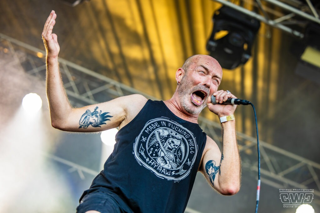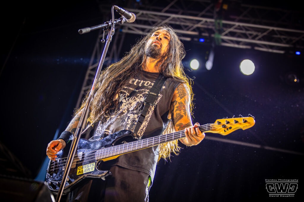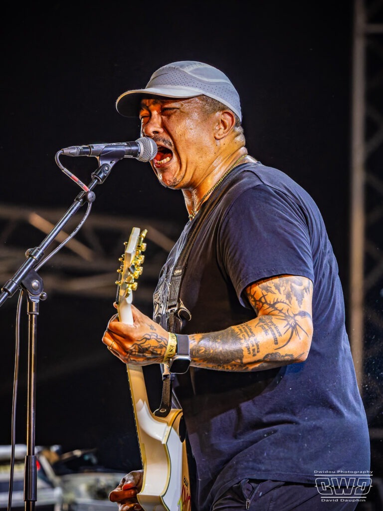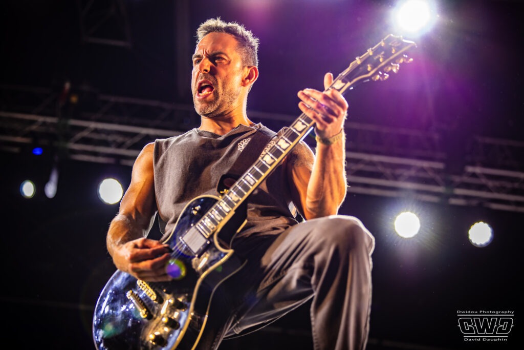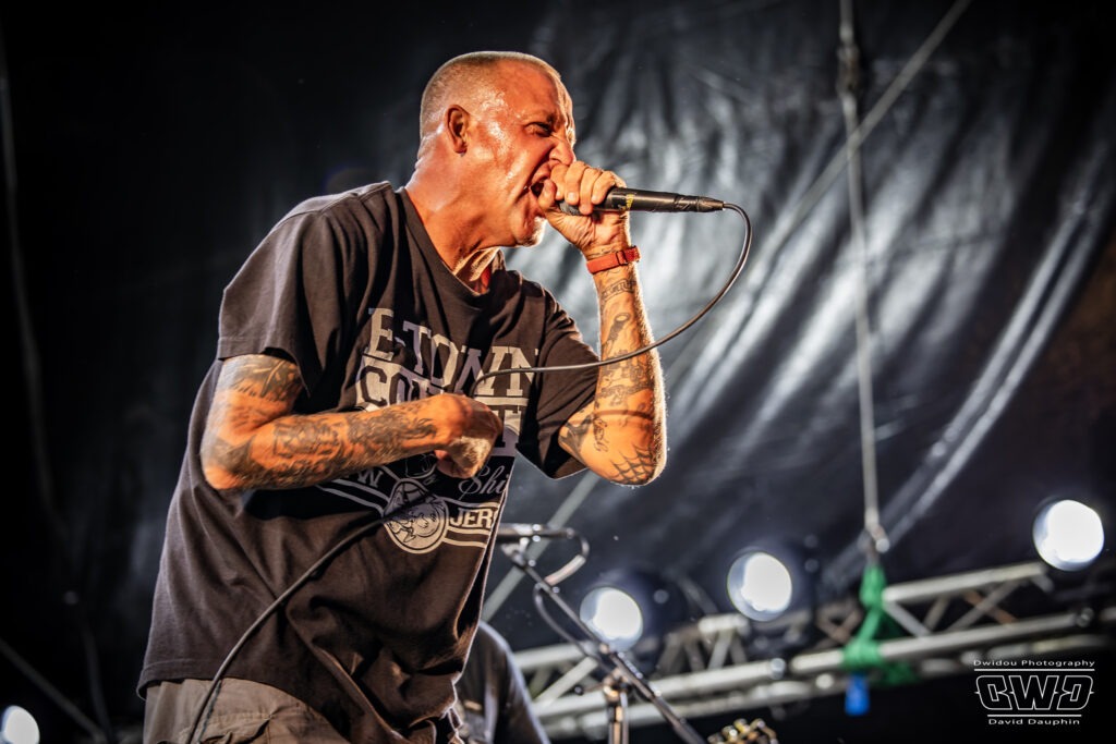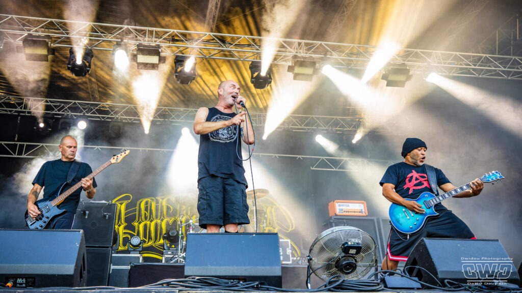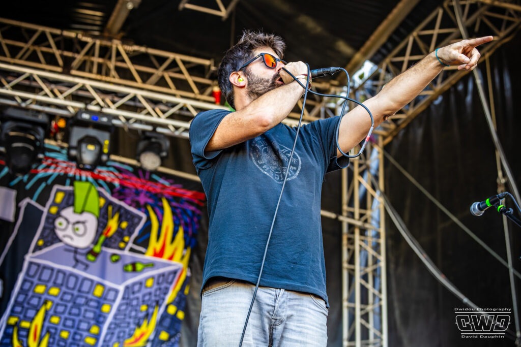 Voilà enfin le premier gros morceau du festival. Et ce n’est pas moins que le monumental Lofofora que l’on ne présente plus ! Le show démarre avec un public conquis dès l’entrée des musiciens sur scène. On sent la clameur pousser le groupe pour nous délivrer un set de haute volée. C’est un mur en béton que l’on prend dans la face tant l’osmose entre Daniel, Vincent et Phil est grande. Reuno peut poser sa voix et son discours en toute sérénité sur ce mur sonore que lui bâtissent ses trois compères.