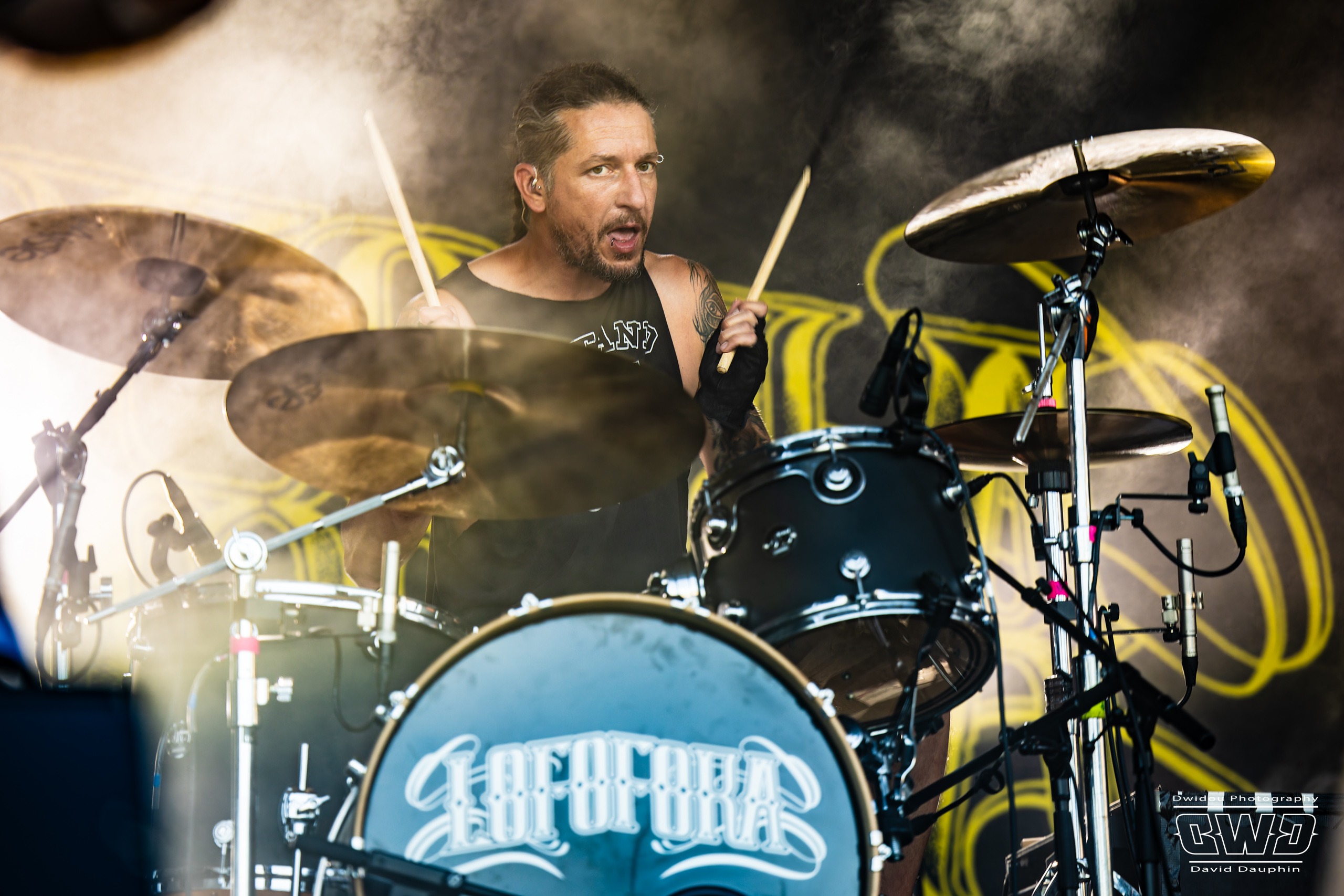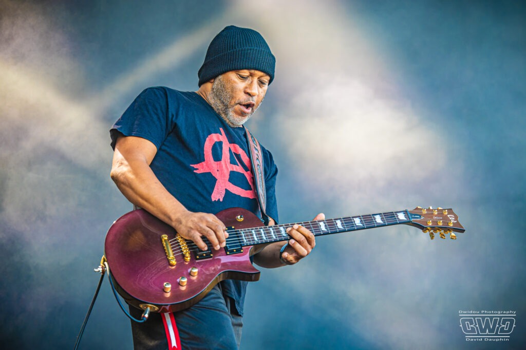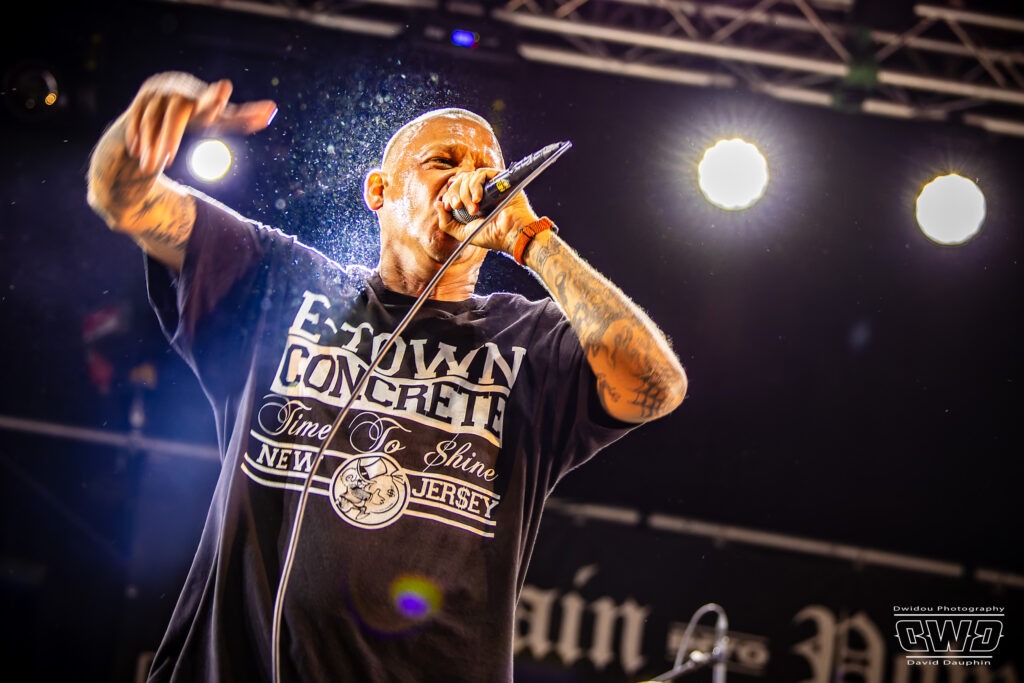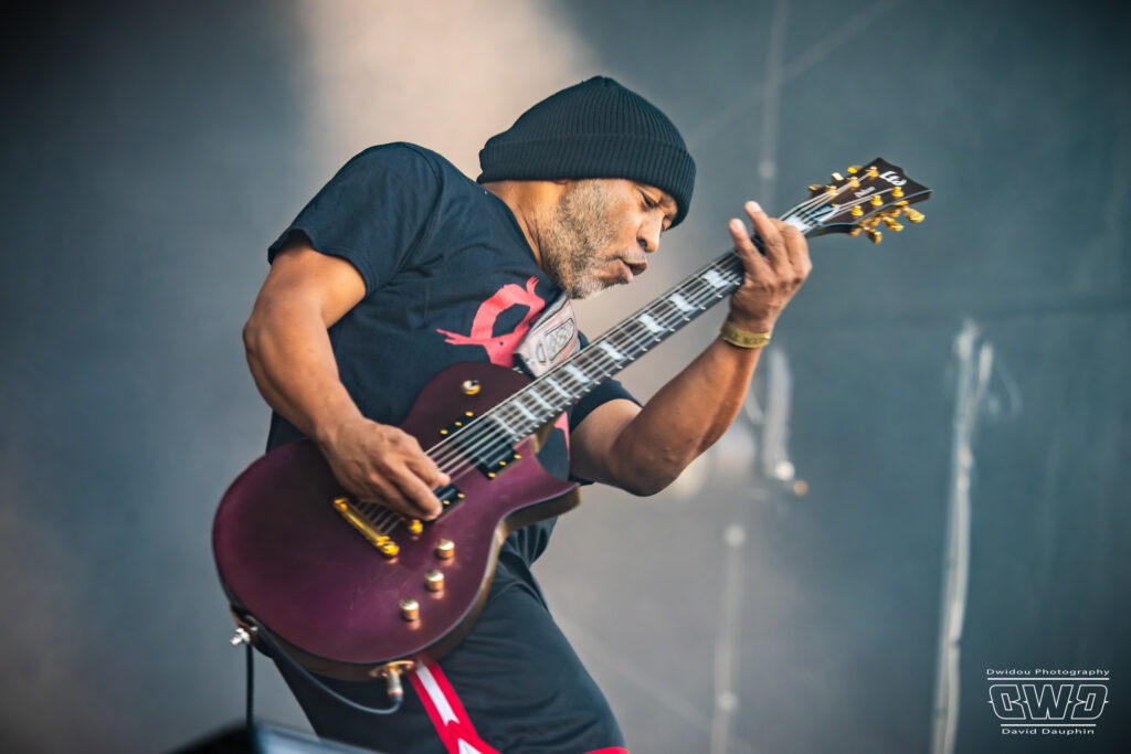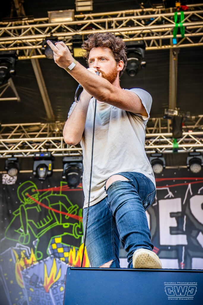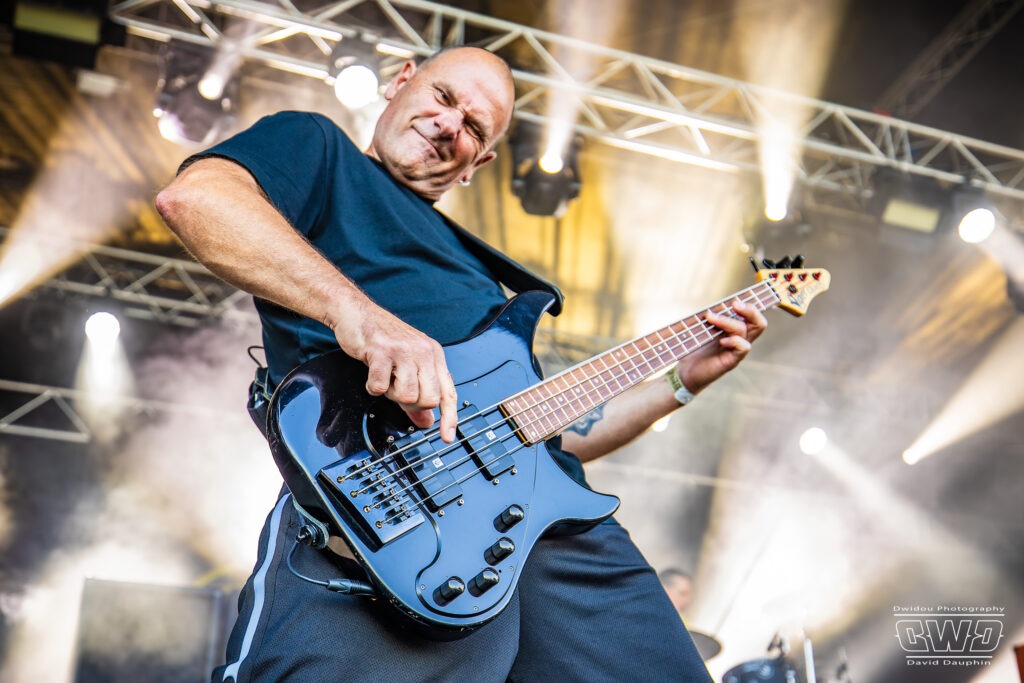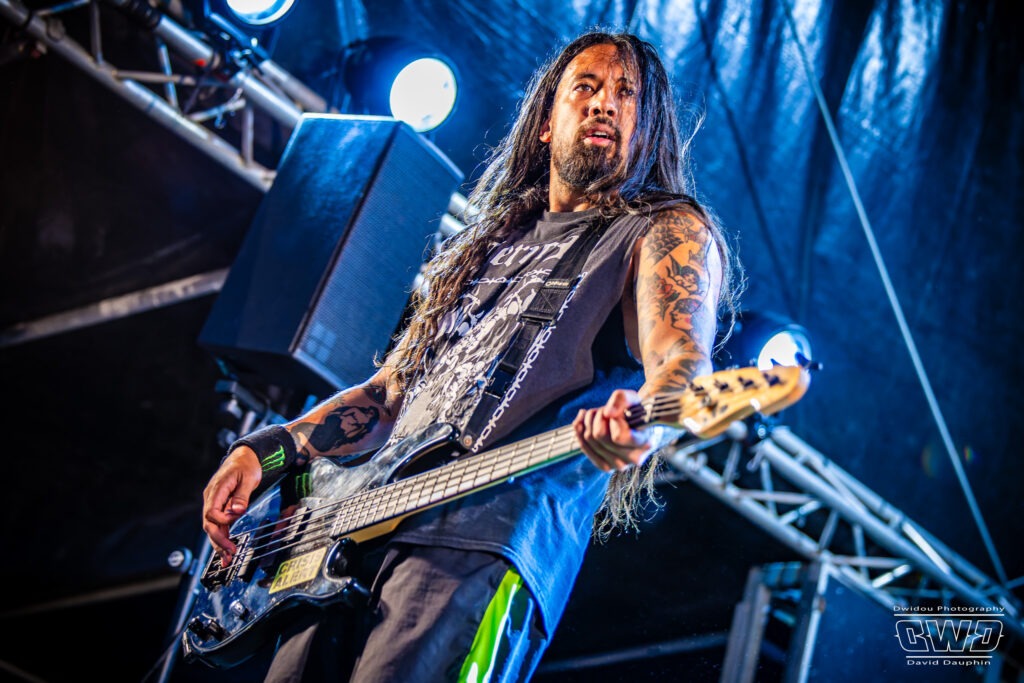 Voilà enfin le premier gros morceau du festival. Et ce n’est pas moins que le monumental Lofofora que l’on ne présente plus ! Le show démarre avec un public conquis dès l’entrée des musiciens sur scène. On sent la clameur pousser le groupe pour nous délivrer un set de haute volée. C’est un mur en béton que l’on prend dans la face tant l’osmose entre Daniel, Vincent et Phil est grande. Reuno peut poser sa voix et son discours en toute sérénité sur ce mur sonore que lui bâtissent ses trois compères.