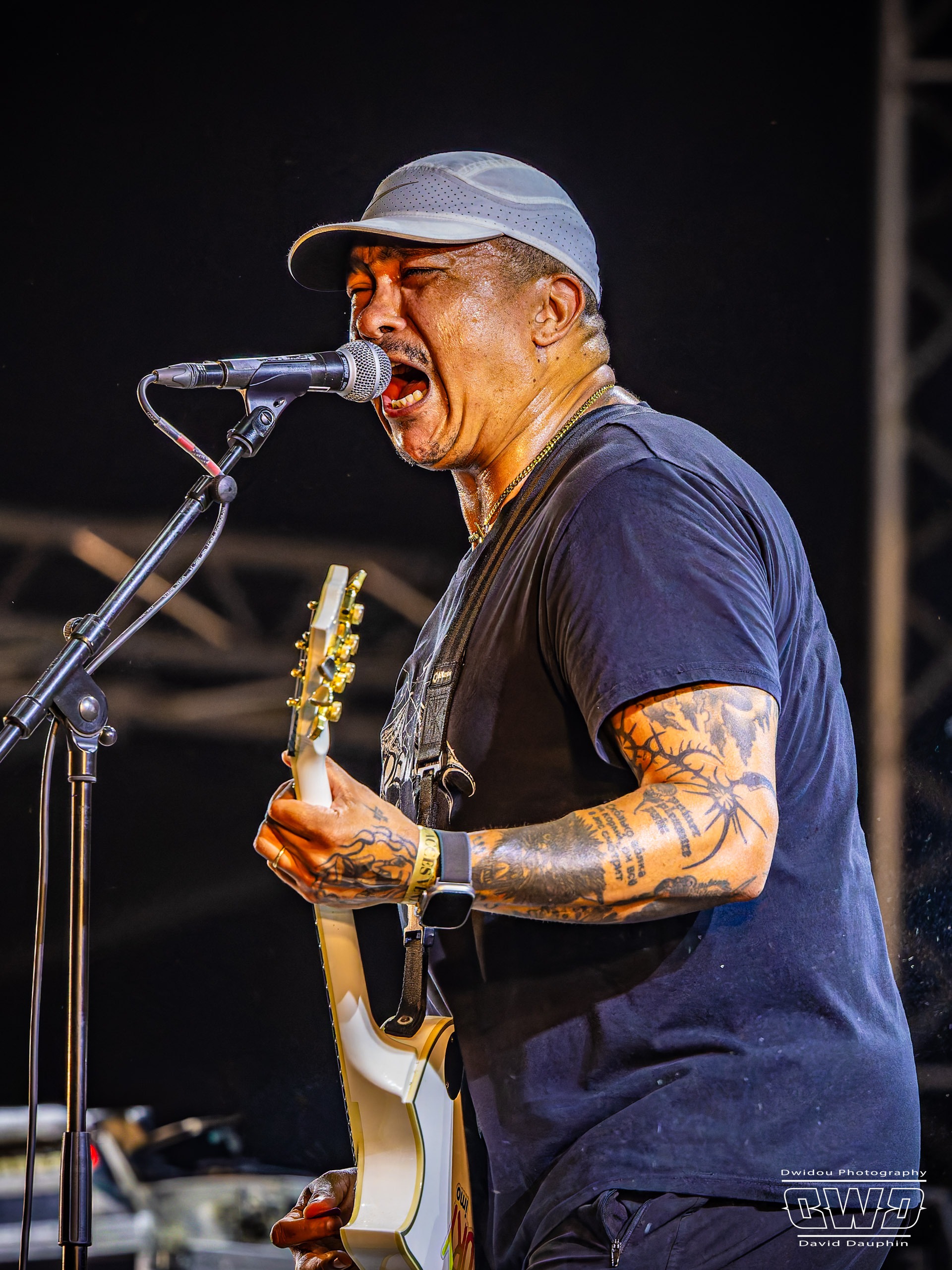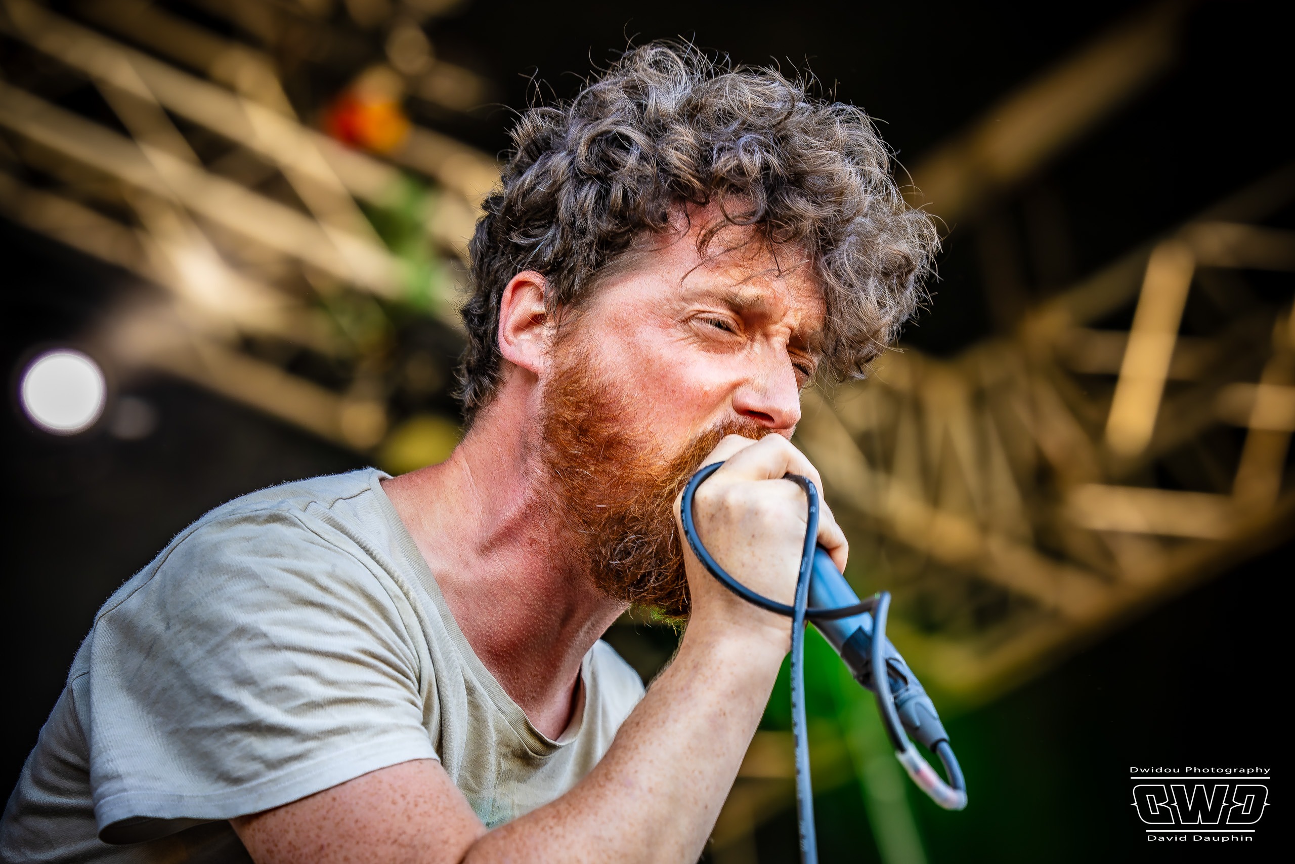 Comme les années passées, dès l’entrée on ressent une bienveillance de la part de toute l’équipe de bénévoles et de la sécurité. Un petit « village » regroupant restauration, stands, bar et sanitaires, surplombe le terrain qui accueille les 2 scènes juxtaposées et de taille similaire. Des Brumisateurs ont été mis en place pour le confort des festivaliers alors que la température est annoncée à 31° pour ce premier jour, 35 pour le deuxième, et jusqu’à 39° pour le troisième et dernier jour.