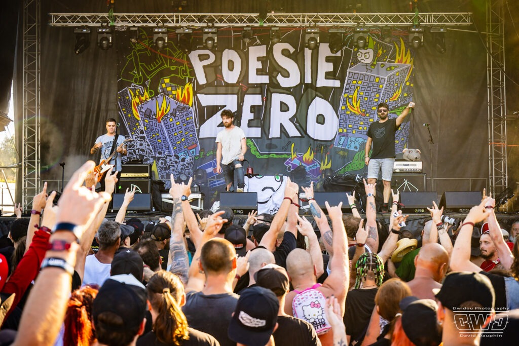 On saute à nouveau du coq à l’âne pour retrouver le trio Poésie Zéro sur la bien nommée « Bad MotherFucker Stage » du festival 666. Fidèle à sa réputation d’irrévérencieux du punk-rock, le groupe commence son set en insultant le public, le festival et tout ce qui lui passe par la tête. 2 chants, 1 guitariste et des samples plongent le public dans un univers loufoque et décalé. Le public se prête au jeu et participe au dialogue instauré par le leader François-Xavier