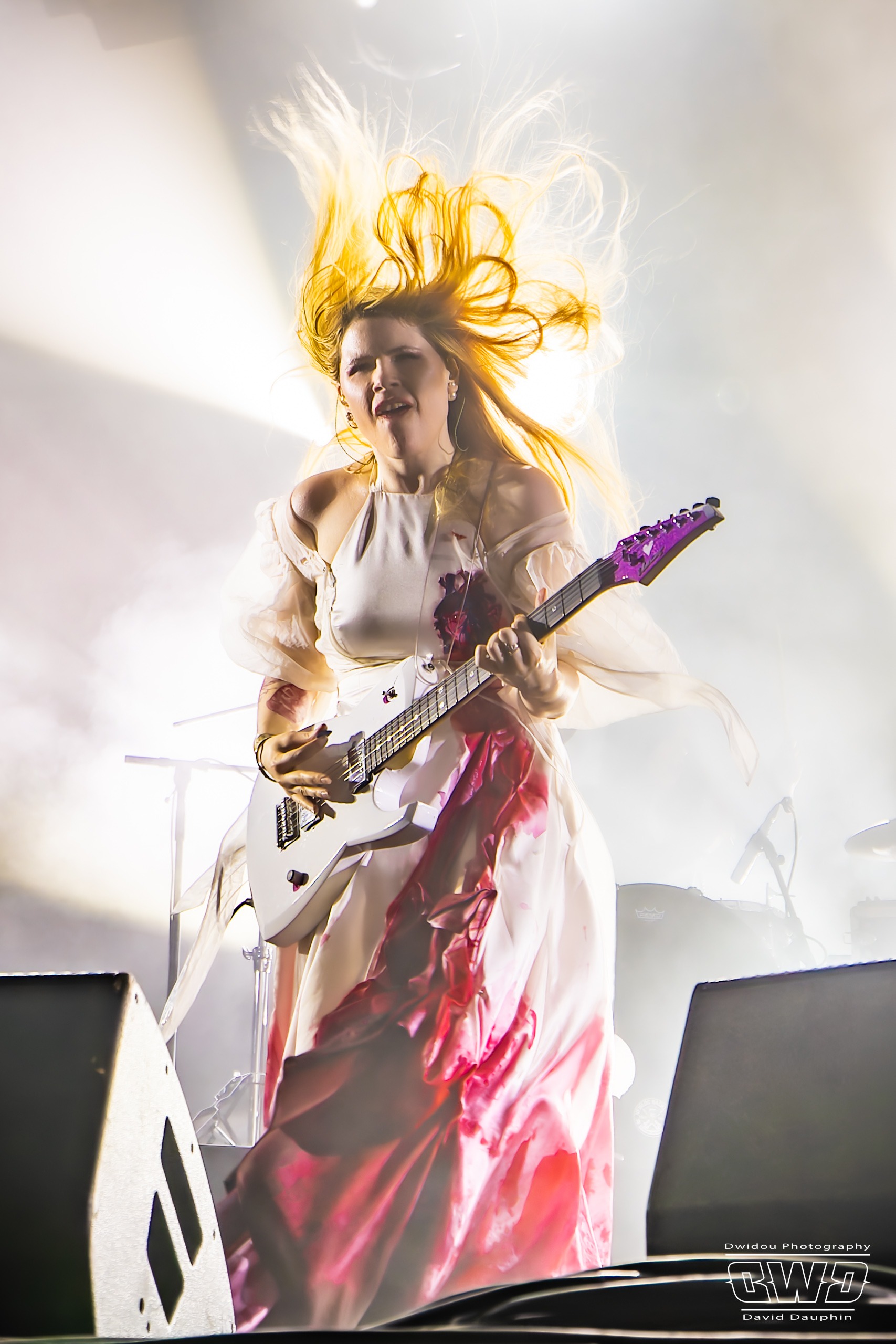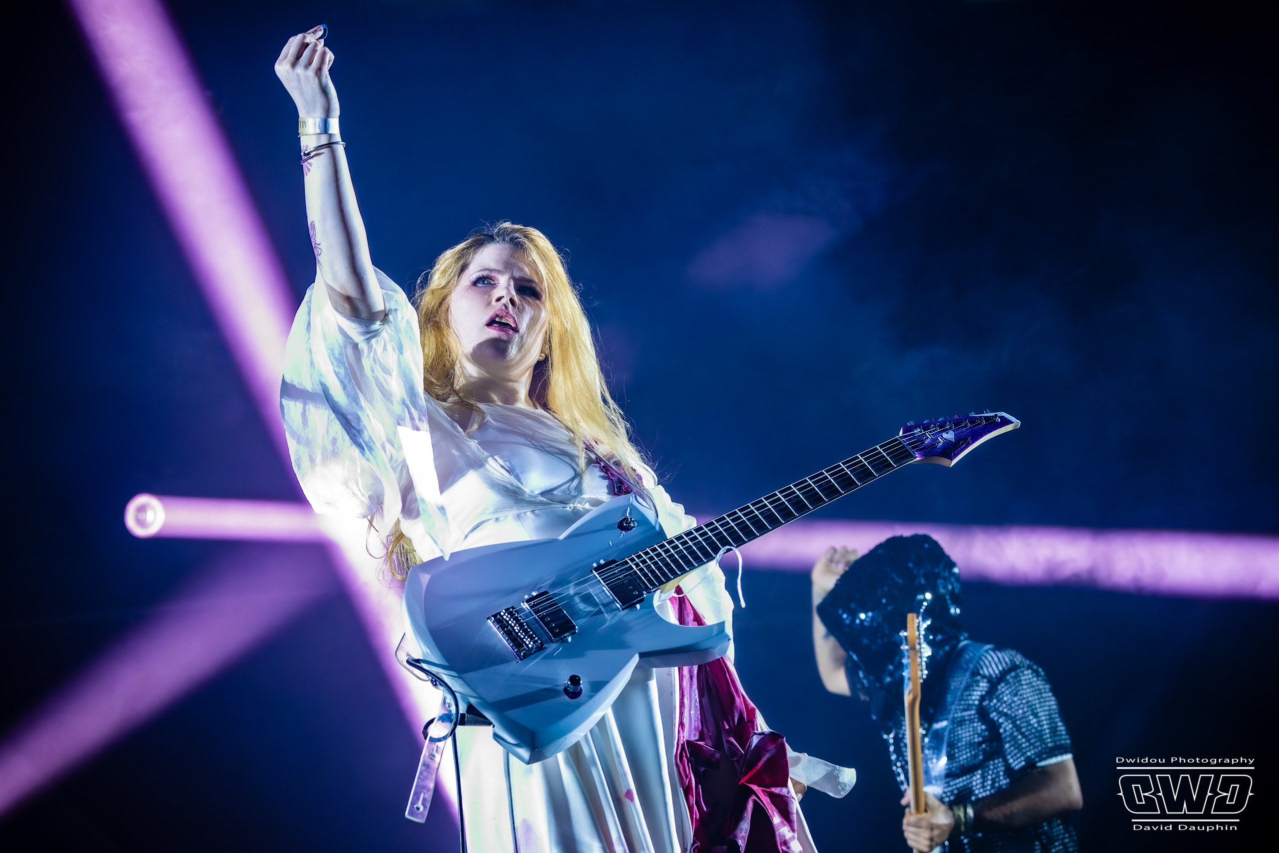 Bien que beaucoup de festivaliers soient pris de court par la chanteuse, une bonne partie des présents rentrent dans son univers particulier et au bout de quelques morceaux, elle se met le public dans la poche. Visuellement c’est assez fort avec une Sun en robe et frou-frou, des musiciens encapuchés dont on peine à entrevoir le visage, et des éclairages stroboscopiques en arrière plan derrière tout cela !