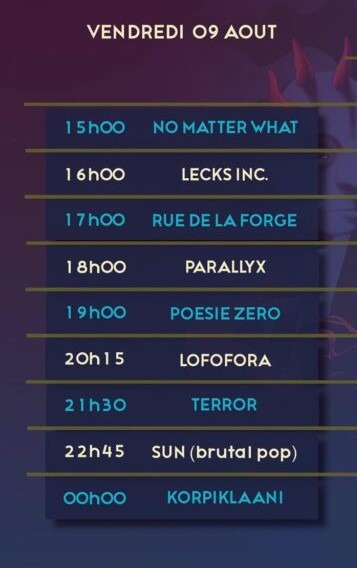 Vendredi 9 août 2024, 1er jour du Festival 666 avec : No Matter What, LECKS Inc., Rue De La Forge, Parallyx, POESIE ZERO, Lofofora, Terror, SUN, Korpiklaani