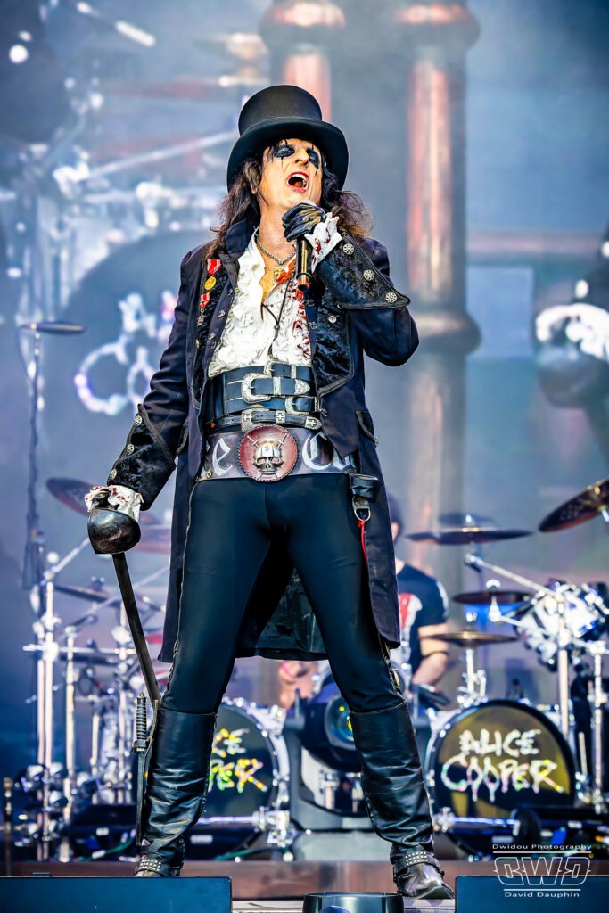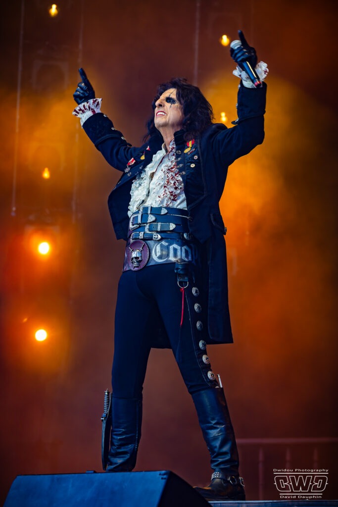 Après la sensationnelle prestation de Tom Morello, le changement de décor est radical pour accueillir le roi du Shock Rock, Alice Cooper et son extravagance théâtrale. Du haut de ses cinquante ans de carrière, ce monstre sacré continue de livrer avec la même fougue son rock rocambolesque, entouré de sa fine équipe. C’est sabre à la main qu’il entre en scène pour donner le top départ d’un spectacle dont il est l’instigateur depuis des décennies.