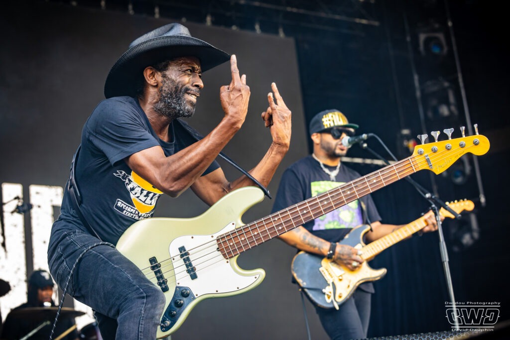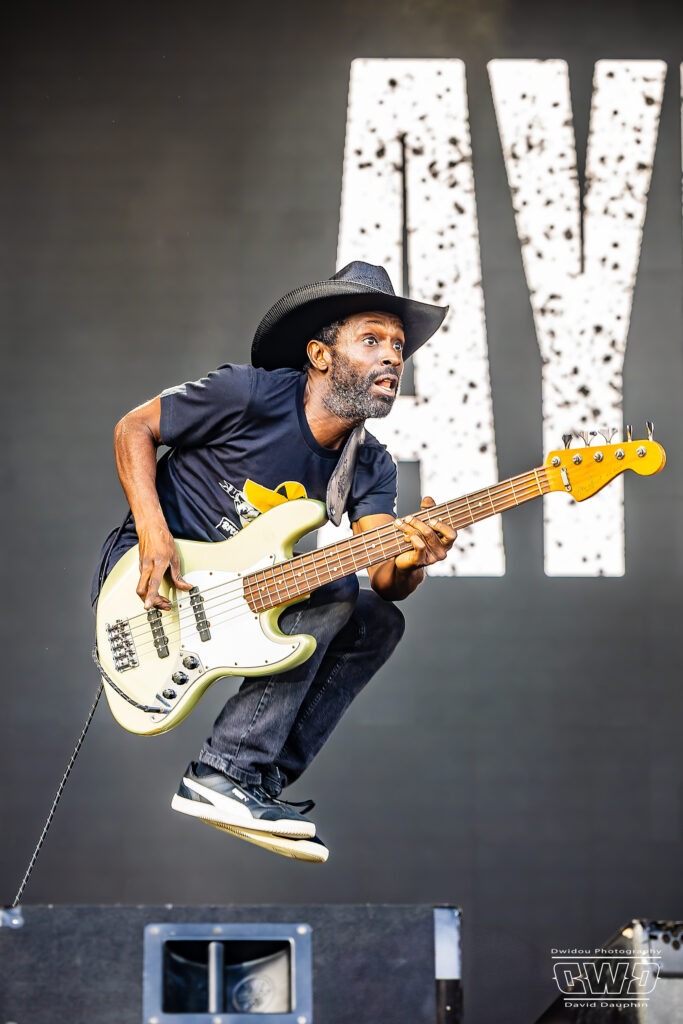 Ayron Jones nous régale de sa voix à la fois rocailleuse et remplie de sensibilité, en interprétant des morceaux issus de ses albums « Child Of The State » (2021) et « Chronicles Of The Kid » (2023). Le musicien reste assez statique derrière son micro, paré de ses lunettes noires, mais son guitariste Matthew Jacquette et son bassiste Bob Lovelace s’échinent à mettre de l’ambiance. Ce dernier est une vraie boule d’énergie, courant de long en large et sautant sur scène.