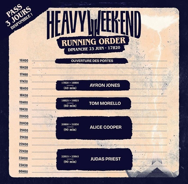 Dernière ligne droite de ce Heavy Week-end avec ce dimanche 23 juin encore une superbe affiche qui envoie du lourd avec Ayron Jones, Tom Morello, Alice Cooper et enfin Judas Priest.