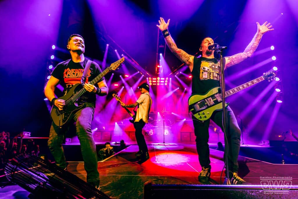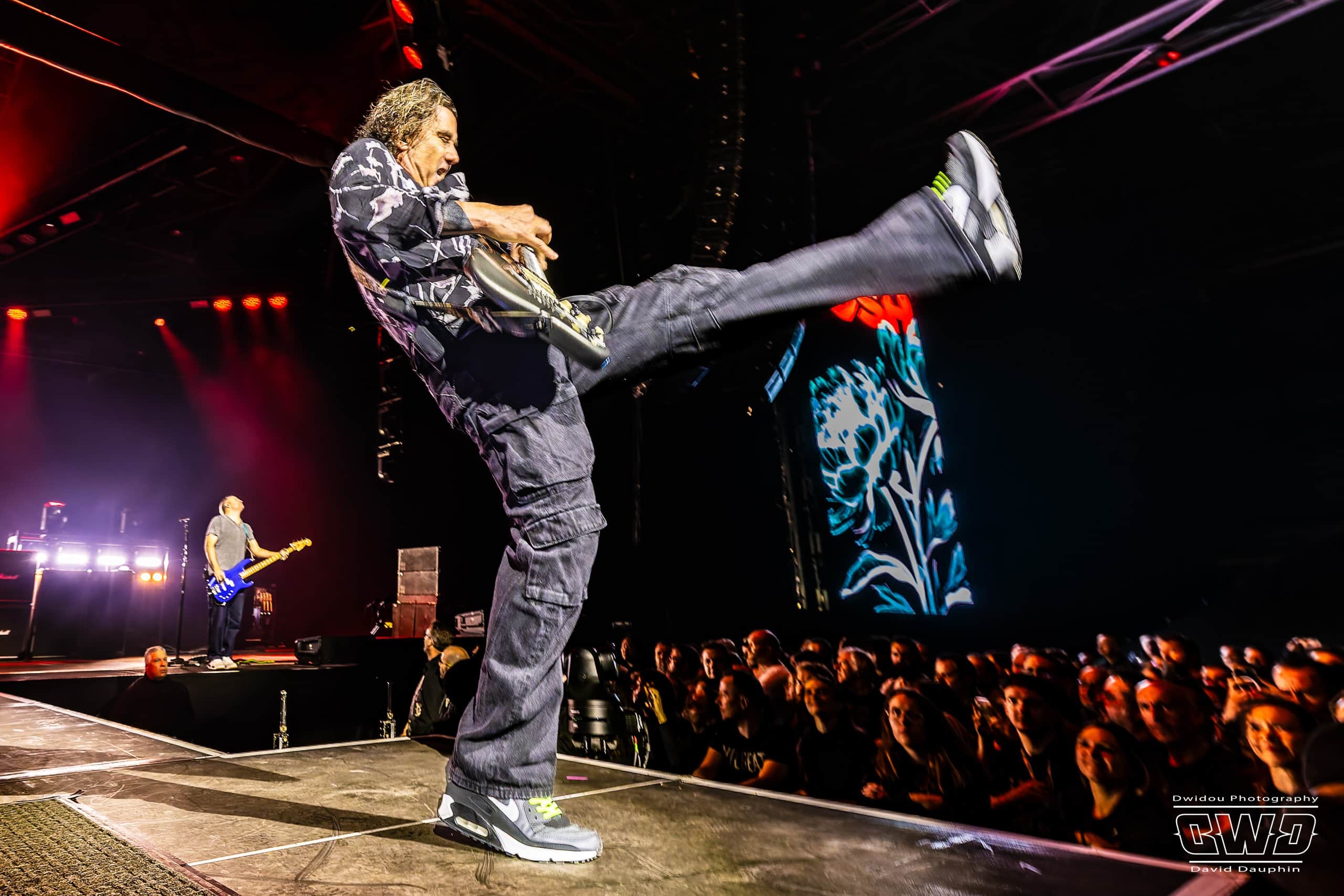 La rythmique tenue de main de maître par Jon à la batterie depuis 24 ans est puissante, à l’opposé du bob un peu décalé du bassiste Kaspar. Dans la salle le thermomètre est à son maximum, c’est bon enfant et quelques slammeurs, en nombre limité, s’amusent à traverser la fosse de bras en bras pour atterrir au pied de l’avancé de scène que Michael, Flemming et Kaspar arpentent en permanence.