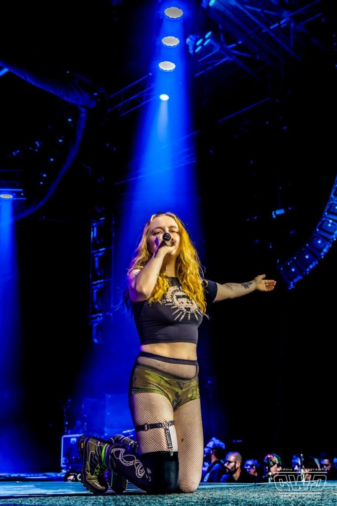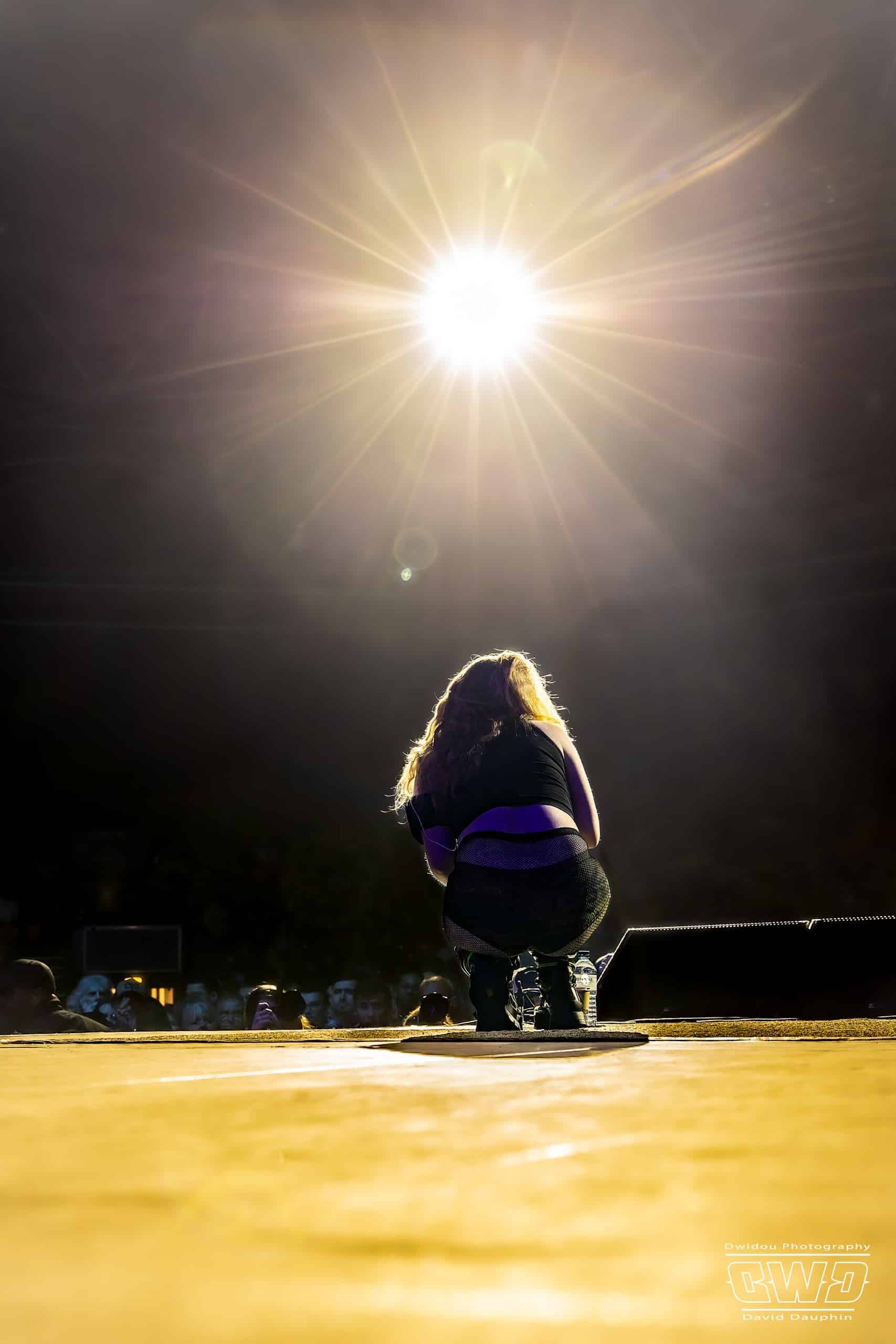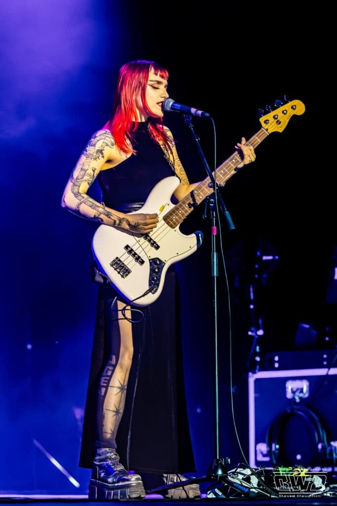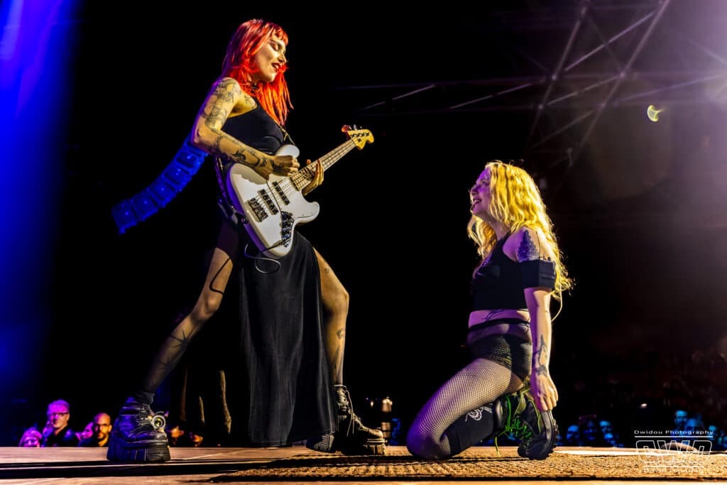 Malgré tout le groupe délivre une prestation sérieuse. Avec une chanteuse lead très présente, rejointe fréquemment par la bassiste sur l’avancée de scène, alors que la guitariste restera très discrète dans son coin à gauche de la scène.
